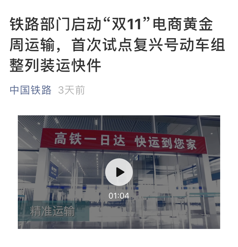 自11月1日始,铁路“双11”电商黄金周运输服务启动,首次试点复兴号动车组整列装运快件,努力满足人民群众日益增长的物流服务需求。