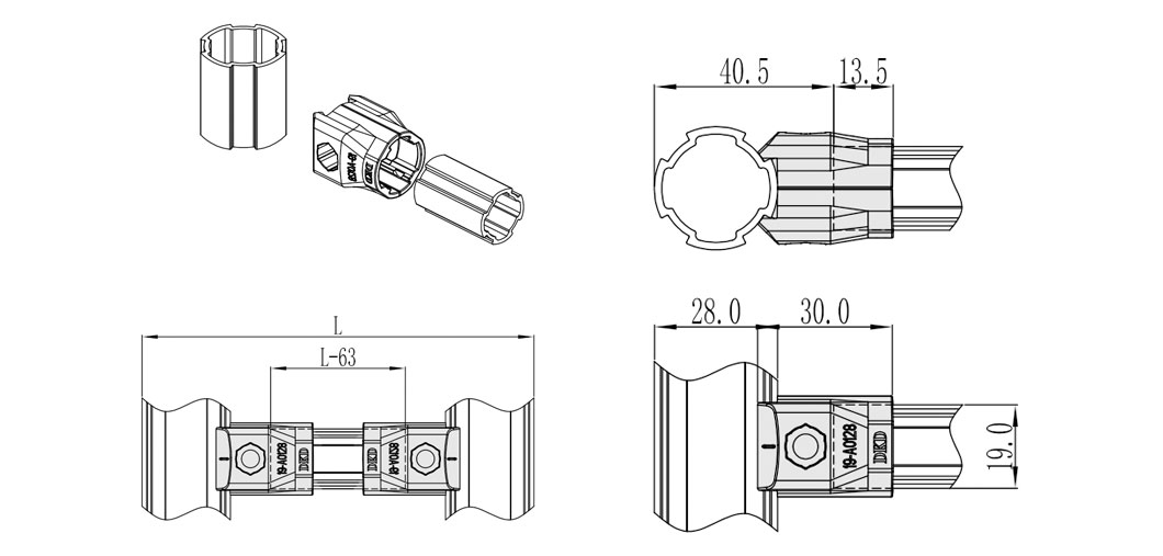 三代Φ19精益管于Φ28精益管连接90°结构的基本外接头,可与线棒四个方向连接,是框架结构的主要连接件。