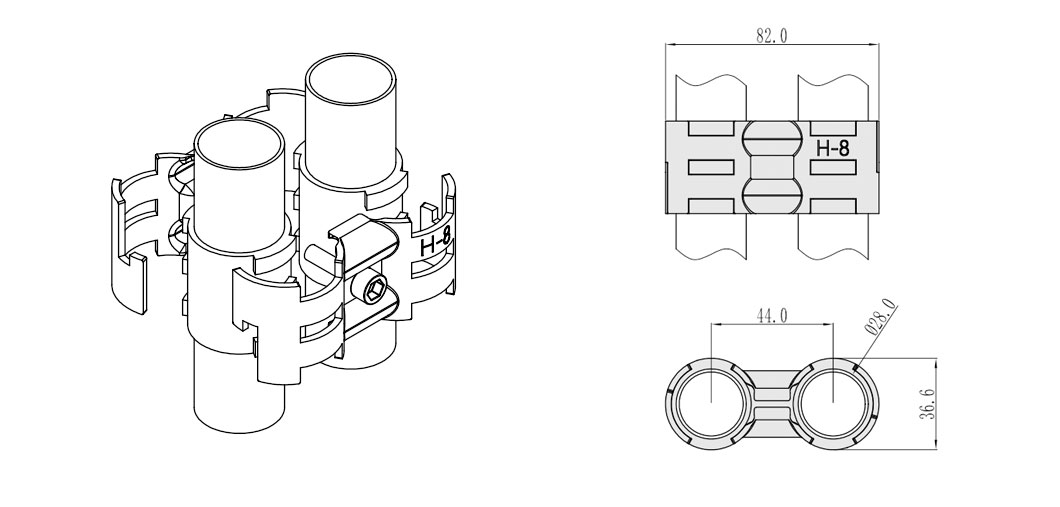 一代精益管平行结构单边转动的连接接头,由两片H-9、两个衬套(J-140)和一套螺丝组装。