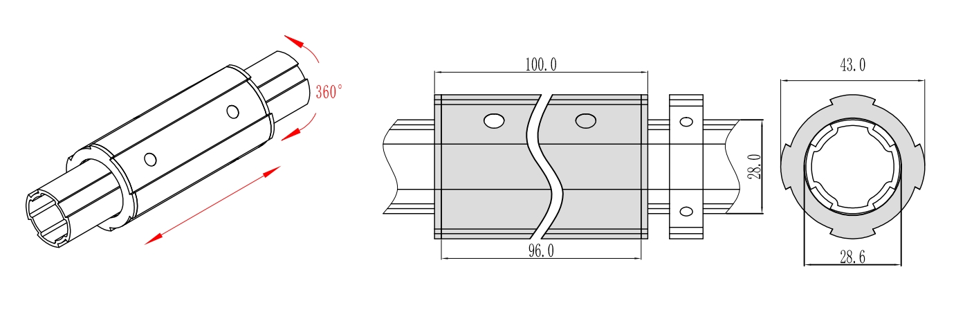 用于Φ28三代精益管上实现水平方向直线滑动,以及轴向360°旋转。